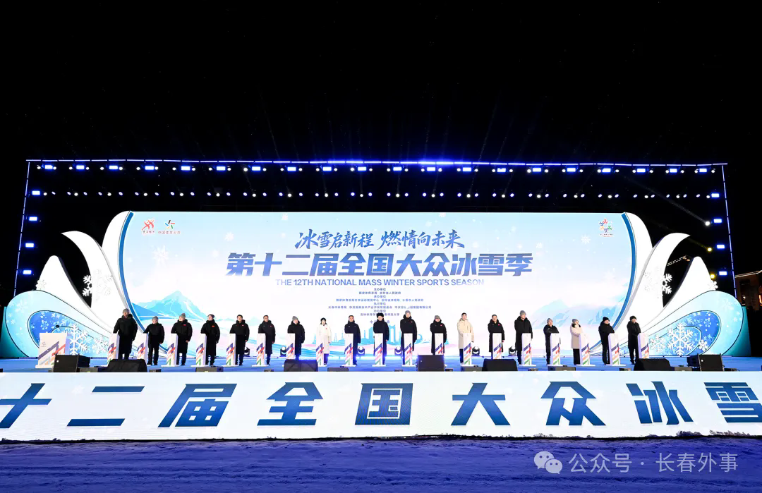 19时许,启动仪式正式开始,全场奏唱国歌。省政府党组成员金育辉致欢迎辞,诚邀各地朋友到吉林滑粉雪、赏雾凇、观冬捕,携手共创大众冰雪运动更加美好的明天。国家体育总局副局长佟立新致辞,预祝第十二届全国大众冰雪季圆满成功。国际奥委会主席考文垂视频致辞,祝愿大家度过一个精彩纷呈的雪季,尽享运动之乐、友谊之暖、冰雪之欢。优秀运动员代表周洋、武大靖共同宣读《冰雪运动倡议书》,文化和旅游部产业发展司司长缪沐阳发布“跟着赛事去旅行”2025—2026中国冰雪赛事活动目录。