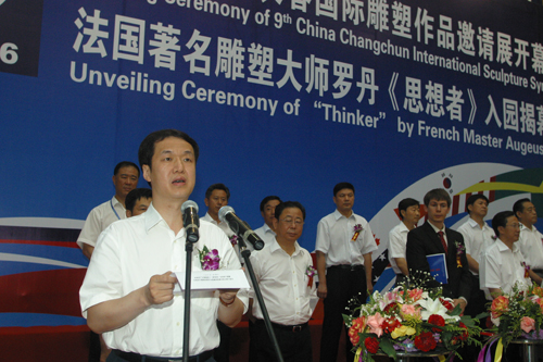 省委常委、市委书记高广滨在开幕式上致辞。高广滨首先代表长春市委、市政府和745万热情好客的长春人民向光临第九届长春雕塑展的嘉宾和艺术家表示热烈的欢迎和衷心的感谢。高广滨说,雕塑是凝固的音乐,是活化的历史,是全人类最生动、最美丽的语言,围绕“友谊·和平·春天”的主题,经过多年发展建设,长春世界雕塑公园已经汇集了来自172个国家和地区的347位雕塑家的391件雕塑艺术品。本届雕塑展又新增39个国家和地区的雕塑家参展,特别是法国雕塑大师罗丹《思想者》入园,在长春雕塑发展史上具有里程碑的意义。长春将把雕塑公园建设的更加美丽、更加开放,让长春人民和中外宾客充分享受人类文化珍品,雕塑艺术盛宴。