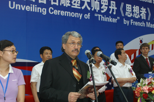 沙特阿拉伯艺术家卡马尔 阿穆瓦莱姆代表参展雕塑家发言。卡马尔首先对长春市的邀请表示感谢。对于我们而言,这是一次十分难得的机会,来自世界不同国家、地区,有着不同文化背景,讲不同语言的艺术家,因为艺术这个全人类共同的语言相聚在长春,进行经验交流和艺术探讨。美丽的长春可以让人立刻联想到中国璀璨文明的博大精深和强大的创造力,相信在与中国文化和艺术互动的50多天里,我们每个人都会增长知识,提高艺术水平,我们将竭尽全力,创作优秀的作品,这是我们的使命,只有这样才符合尊贵的长春世界雕塑公园的地位。