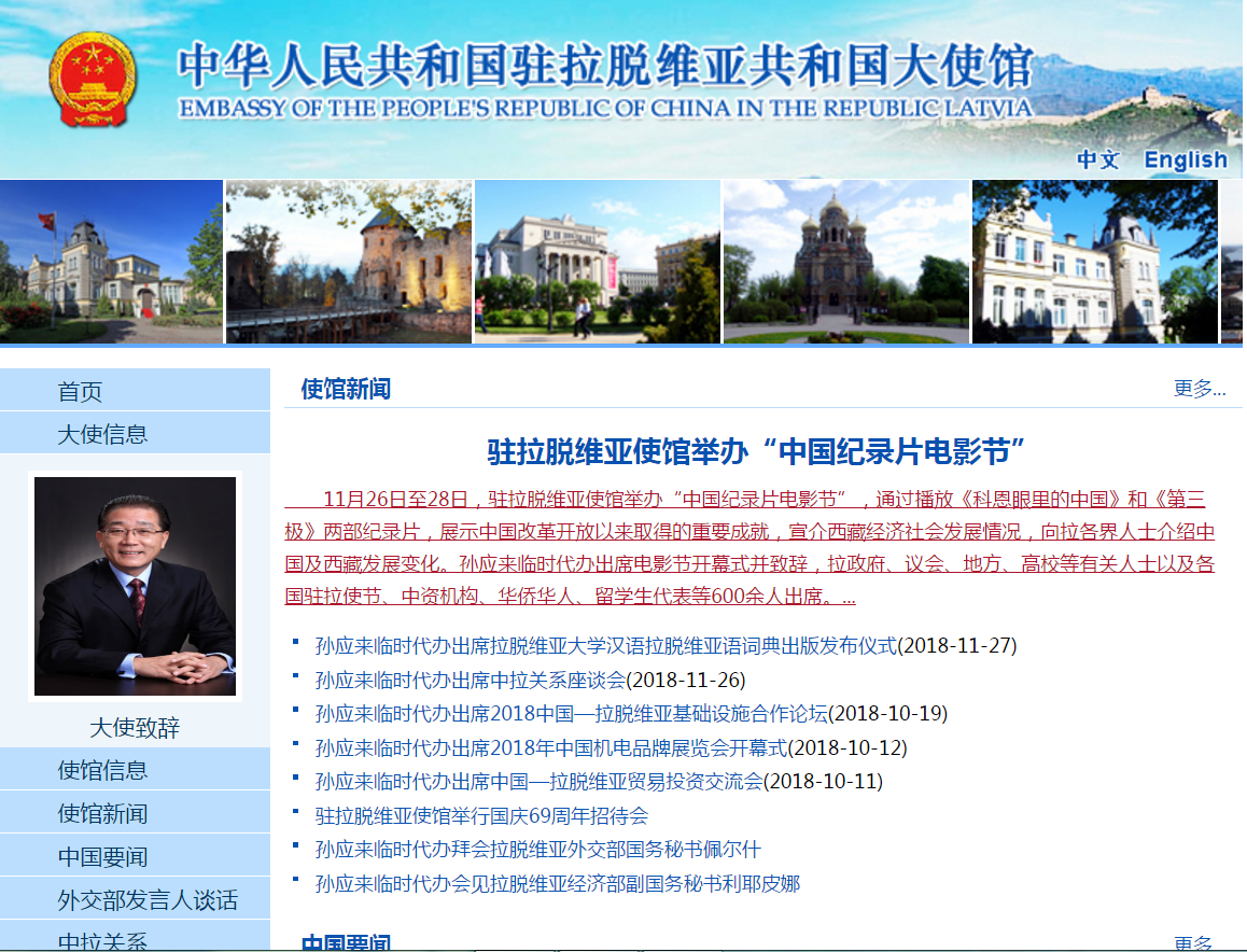 2018年11月26日,由中国驻拉脱维亚大使馆主办的“中国纪录片电影节”在拉首都里加辉煌宮影院拉开帷幕,拉政要、议员、外国驻拉使节及媒体等约二百人出席。开幕式上,来宾们欣赏了由长春市人民政府提供的纪录片《科恩眼里的中国》,拉各界人士好评如潮。