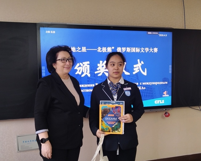 受克拉斯诺亚尔斯克市政府委托,伊丽娜·妮娜副校长为长春外国语学校在“极地之星—北极熊”俄罗斯国际文学大赛短篇小说单元中夺冠的学生及指导教师颁发了荣誉证书和奖品。