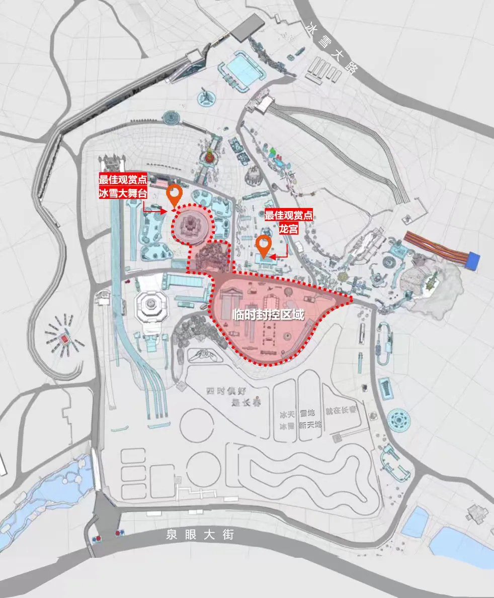 在冰雪新天地周边区域设有多个临时停车场,近端停车场趋于饱和,交管部门将对冰雪大路、泉眼大街、莲花山大路、天健路、雾开河大街等道路实施临时通行管控。其间,公交车辆优先通行,请自驾游客提前关注路况,合理规划行车路线,并配合现场交警交通管控。