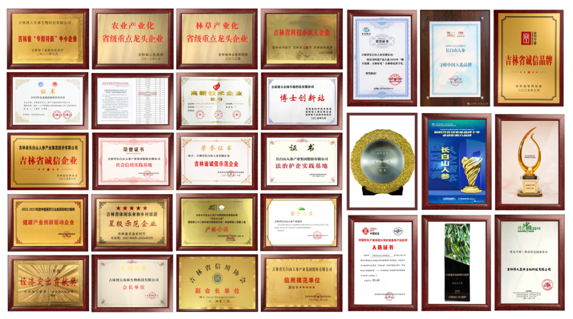 集团及下属企业先后成为国家技术标准创新基地(人参产业)常务理事单位、中国民族卫生协会成员单位、吉林省参业协会副会长单位、吉林市参业协会会长单位、吉林省长白山人参种植联盟副理事长单位等20余个社会团体会长或副会长单位。集团及下属企业获得国家市场监督管理总局确认的“守护品牌”政企协作机制成员、2025年全国企业诚信建设优秀实践案例、省级农业产业化重点龙头企业、省级林草产业化重点龙头企业、省级“专精特新”中小企业、吉林省科技小巨人企业、吉林省休闲农业和乡村旅游星级示范企业、中国医药行业“最具影响力健康产业创新驱动企业”、联合国环境规划基金会、中国环境保护协会联合授予“绿色中国”环保成就奖、入选2025年“畅享消费,吉林好礼”吉林特色伴手礼等殊荣。